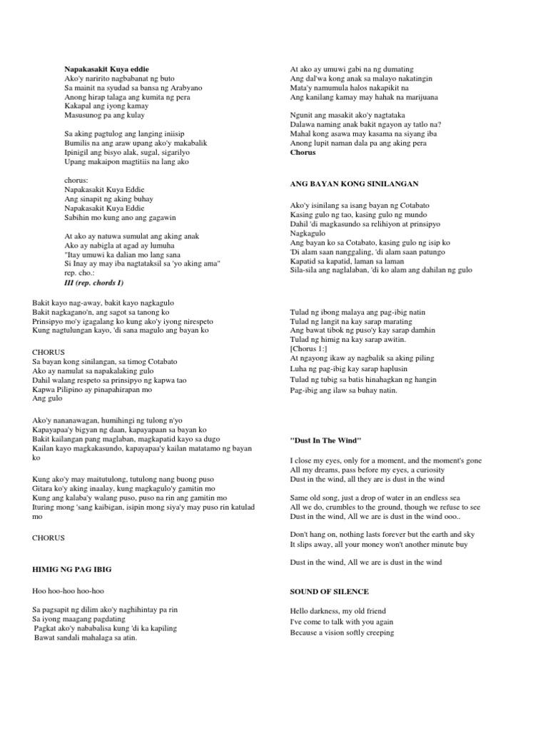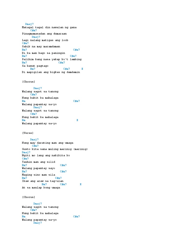 Cadet engr 294 points 113 views. Walang sagot sa tanong Kung bakit ka mahalaga Walang papantay sayo Kung may darating man na umaga Gusto kita sana muling marinig marinig Ngiti mo lang ang nakikita ko Tauhin man ang silid Walang papantay sayo Maging sino man sila Ikaw ang araw sa tag-ulan At sa maulap kong umaga Walang sagot sa tanong Kung bakit ka mahalaga Walang. Intro Dmaj7 Cm7 Verse Dmaj7 Matagal tagal din nawalan ng gana Cm7 Pinagmamasadan ang dumaraan Dmaj7 Lagi nalang matigas ang loob Cm7 Sabik na may maramdaman Bm7 Cm7 Di ka man bago sa paningin Bm7 Cm7 Palihim kang nasa yakap kot lambing Bm7 Cm7 Sa bawat pagtago Bm7 Cm7 E Di mapigilan ang bigkas ng damdamin Chorus Dmaj7 Walang sagot.